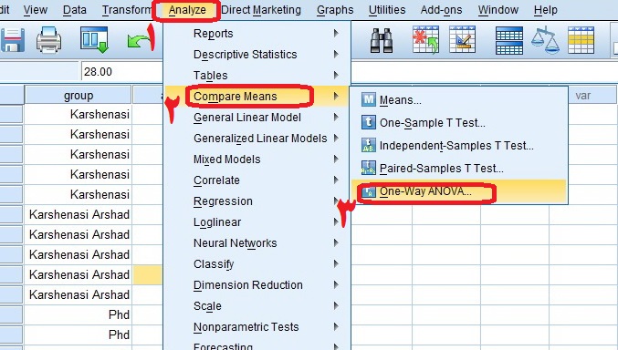 نرم افزار SPSS را باز کرده و به مسیر زیر بروید: Analyze> Compare Means> One Way Anova.