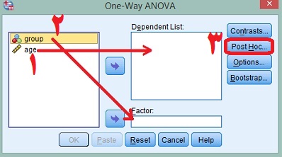 پس از باز شدن صفحه جدید، مطابق شکل زیر متغیر وابسته (سن) را در کادر Dependent List وارد کنید و در کادر Factor متغیر گروه را وارد کنید. در مرحله بعد گزینه Post Hoc را بزنید.