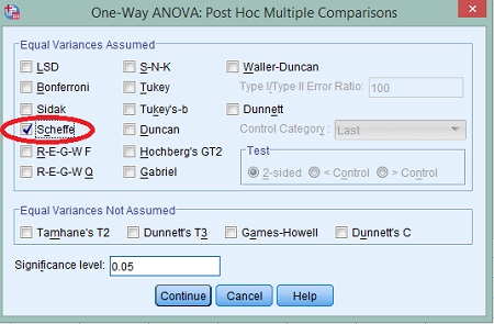 تحلیل واریانس یک راهه (ANOVA)در صفحه جدید تیک گزینه Scheffe را بزنید تا تحلیل تعقیبی شفه انتخاب شود سپس بر روی گزینه Continue  کلیک کنیدو پس از آن Ok را کلیک کنید. دلیل انتخاب این گزینه به سبب وجود سه گروه است. تحلیل واریانس یک راهه دو جدول به شما خواهد داد. در جدول اول نشان داده می‌شود که آیا بین این سه گروه تفاوت وجود دارد یا نه. فرض کنید که تفاوت معناداری مشاهده شد، در این صورت ما نمی‌دانیم که کدام گروه با کدام گروه دیگر تفاوت دارد. آیا سن کارشناسی از کارشناسی ارشد کمتر است؟ آیا سن کارشناسی از دکتری کمتر است؟ آیا سن کارشناسی ارشد از دکتری کمتر است؟ در واقع جدول اول پاسخ این سوالات را به شما نمی‌دهد و فقط بیان می‌کند که تفاوت وجود دارد. اما تحلیل تعقیبی شفه نشان می‌دهد که تفاوت مشاهده شده بین کدام گروه است.