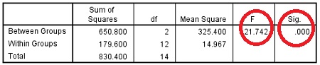 در مرحله بعد نتایج خروجی SPSS مشاهده می‌گردد. در این جدول دو شاخص F و Sig مهم هستند. اگر Sig کمتر از ۵ صدم باشد به معنی این است که بین گروه‌ها تفاوت معناداری وجود دارد که در جدول زیر نیز این تفاوت دیده می‌شود.
