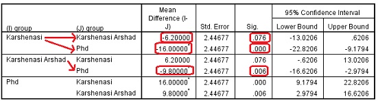 در جدول شماره بعدی نتایج تحلیل تعقیبی مشاهده می‌شود.در این جدول نتایج سه گروه به تفکیک آمده است. برای مثال در سطر اول مشاهده می‌شود که دانشجویان کارشناسی ۶ نمره از دانشجویان کارشناسی ارشد سن پایین‌تری دارند اما این تفاوت معنادار نیست درحالی که میان سن کارشناسی و دکتری و کارشناسی ارشد و دکتری تفاوت معناداری وجود دارد.