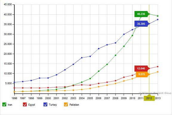 شما در سایت سایمگو امکانات فراوانی برای جستجو دارید. برای مثال در یکی از مطالب قبلی اشاره شد که چگونه میتوان با استفاده از سایمگو مجلهای مناسب برای چاپ مقاله پیدا کرد (این مطلب را ببینید). همچنین شما میتوانید به مقایسه تولیدات علمی کشورهای مختلف بپردازید. برای نمونه در تصویر زیر تولیدات علمی چهار کشور ایران، ترکیه، مصر و پاکستان در حدفاصل سالهای ۱۹۹۶ تا ۲۰۱۳ مورد مقایسه قرار گرفتهاند.