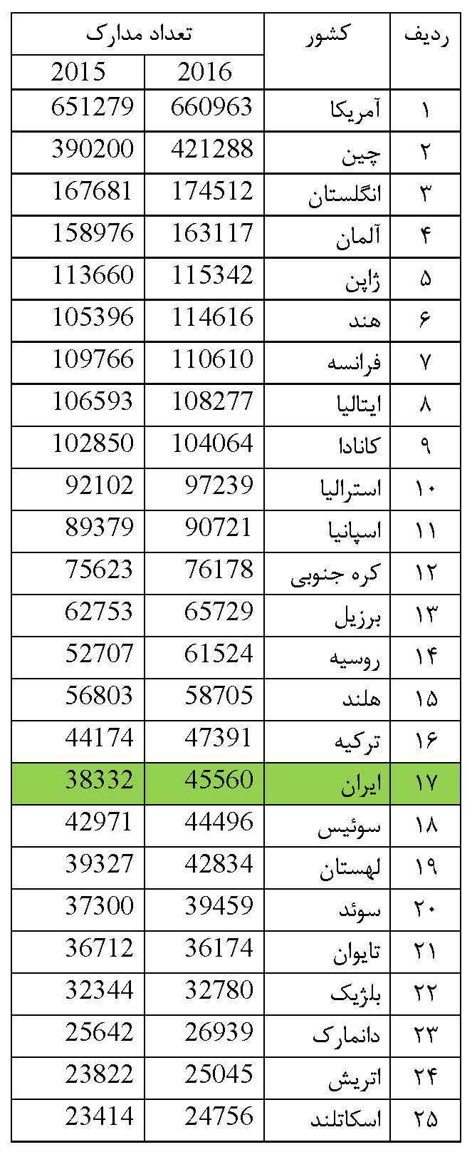 اما آمارهای مربوط به تعداد مدارک علمی تولید شده نیز نشان میدهد که ایران در جایگاه هفدهم دنیا قرار دارد. براساس این آمار، کشور آمریکا با تولید ۶۶۰۹۶۳ مدرک علمی رتبه نخست را در اختیار دارد. کشورهای چین، انگلستان، آلمان، ژاپن، هند، فرانسه، ایتالیا، کانادا و استرالیا نیز به ترتیب در جایگاههای سوم تا دهم قرار دارند.