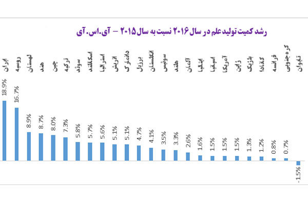 براساس گزارش وب آب ساینس، در بخش کمیت و تعداد مدارک علمی منتشر شده، ایران با ۱۹ درصد رشد نسبت به سال ۲۰۱۵ رتبه نخست را به دست آورده است. ایران در سال ۲۰۱۵ تعداد ۳۸۳۳۲ سند علمی تولید کرده بود که این میزان در سال ۲۰۱۶ به ۴۵۵۶۰ سند رسیده است. روسیه نیز با ۱۶ درصد و لهستان با ۸ درصد رتبههای دوم و سوم را در زمینه رشد تولیدات علمی دارند.