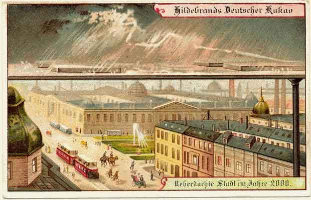 درست همان زمان که کارتپستالهای فرانسوی در قرن نوزدهم در یک نمایشگاه با عنوان “دنیای پاریس” به پیشبینی رویدادهای سال ۲۰۰۰ پرداختند، یک شرکت تولید شکلات آلمانی تصمیم گرفت که طی یک ترفند بازاریابی حیلهگرانه، آینده را پیشبینی کند. برای مدت کوتاهی، شرکت شکلات تئودور هیلدبران، بر روی جعبههای شیرینی خود، کارتهای رنگی رسم میکرد که زندگی فرضی را در قرن ۲۱ به تصویر میکشید. در مجموع، ۱۲ عدد از این کارتها طراحی شدند که پیشبینی میکرد چگونه برخی از فعالیتها در قرن ۲۱ بسیار پیشرفته میشوند.