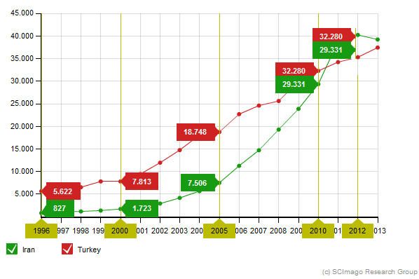 همانطور که در شکل زیر میبینید در سال ۱۹۹۶ ایران تنها ۸۲۷ مقاله تولید کرده است در حالی که این میزان برای ترکیه در حدود ۵۶۲۲ مقاله است. بنابراین میتوان گفت که ترکیه از سالهای قبلتر از ایران بر روی تولید علم سرمایهگذاری کرده است. این تفاوت بین دو کشور در سال ۲۰۰۰ نیز مشاهده میشود. اما از حدود سالهای ۲۰۰۴ و ۲۰۰۵ تولید علم ایران سرعت بیشتری میگیرد. در نهایت در سال ۲۰۱۰ میزان تولید علم ایران و ترکیه تقریباً مساوی میشود. اما ایران بیشترین رشد تولید علم را در بین سالهای ۲۰۱۰ و ۲۰۱۱ تجربه کرده است. به طوری که در طی این دو سال تعداد مقالات ایران از ۲۹۳۳۱ به تعداد ۳۸۸۰۰ مقاله میرسد. بعد از سال ۲۰۱۱ و در طی سالهای ۲۰۱۲ و ۲۰۱۳ نیز تولید علمی ایران از ترکیه بیشتر بوده است.