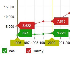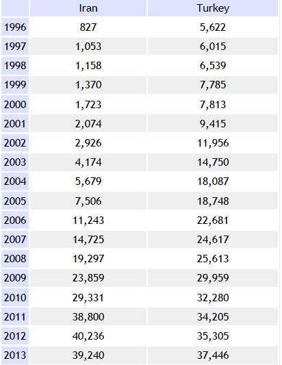 تمامی آمارها و اطلاعات این موسسه رایگان است و به صورت آنلاین میتوان از آنها استفاده کرد. در این نوشته قصد داریم تا رشد تولید علمی ایران و ترکیه را از سال ۱۹۹۶ تا ۲۰۱۳ بر طبق اطلاعات این سایت مورد مقایسه قرار دهیم. اما قبل از ارائه آمارها لازم به توضیح است که رشد تولید علمی در این سایت و سایتهای مشابه تنها محدود به آمارهای کمی است و اطلاعات درباره کیفیت این تولیدات نیز باید مورد بررسی قرار گیرد.