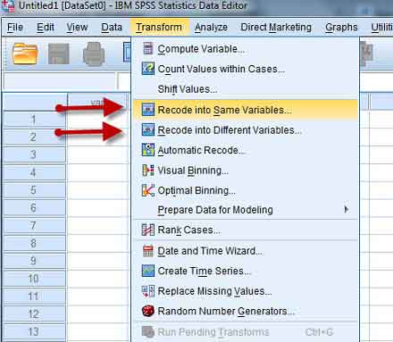 ۱- به مسیر Transform < Recode into same variables بروید.