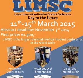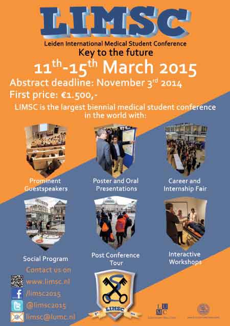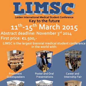 نهمین کنگره بین المللی دانشجویان پزشکی LIMSC در تاریخ یازدهم تا پانزدهم مارس ۲۰۱۵ (۲۰ تا ۲۴ اسفند ۱۳۹۳) برگزار خواهد گردید. کنگره بین المللی دانشجویان پزشکی LIMSC یکی از معتبرترین همایشهای دانشجویان پزشکی در دنیا محسوب میشود که توسط مرکز پزشکی دانشگاه لیدن هلند برگزار میگردد. این کنگره هر دوسال یکبار برگزار میگردد و در دوره قبلی بیش از ۶۰۰ دانشجو از ۵۰ کشور جهان در آن شرکت کردند. قابل ذکر است که مهلت ارسال خلاصه مقالات به این کنگره تا سه نوامبر (۱۲ آبان) است. محورهای این کنگره در زیر آمده است.